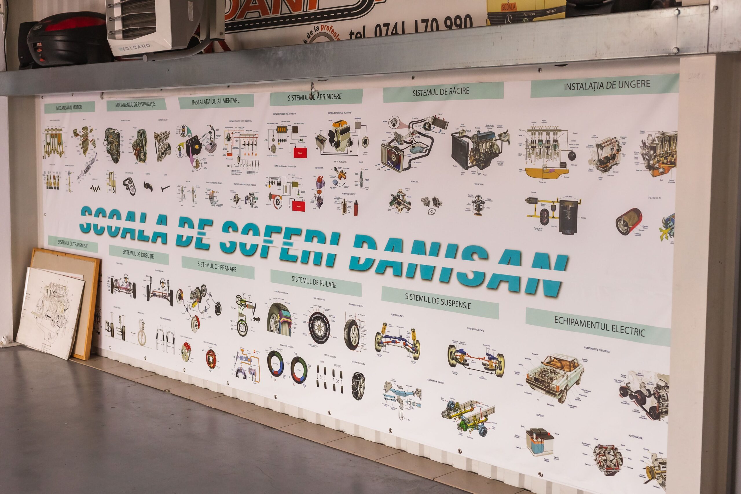 Deținem o bază materială solidă, ce cuprinde: sală de legislație, sală modernă de mecanică, un parc auto dotat cu autovehicule destinate tuturor categoriilor și materiale didactice cu care puteți eficientiza la maxim procesul de învățare.